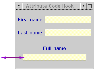 The string attribute of the Full Name text entry takes value based upon the script that combines the values of the other two entry fields. Whenever either of the source string attributes changes in value, the script runs again, updating the contents of the Full Name field.