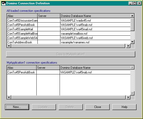 If you have loaded several applications that define connection specifications, you might want to use one of those already defined. Select the connection specification you want to copy from the upper listbox and press the Copy to application button. The spec is copied to the lower listbox and is available for future use in your application.