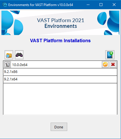 When Environments is initially run, only the VAST Platform Installation that it is a part of is registered to the system. This panel is used to register additional VAST Platform Installation locations, or remove ones that are no longer available or needed.