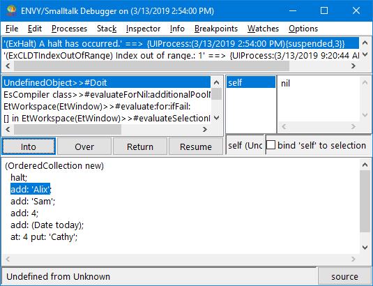 You can try each one of these out from the debugger opened in Adding the message halt. To begin, select UndefinedObject>>#Doit from the stack. The message halt is highlighted in the description pane with the statement add: 'Alix' below it. Select Into. The statement add: 'Alix' is now highlighted with UndefinedObject>>#Doit the top of the stack.