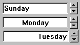The following example code creates a WkSpinButton that has been initialized with the days of the week. The initial value has been set to “Sunday”.