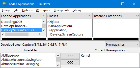 Note that several changes take place in the browser. The application name appears in the list of applications. The initial classes for DevelopScreenCapture are listed in the upper middle pane named Classes. And the default prerequisite application, Kernel, is listed in the lower right pane named Current Prerequisites.