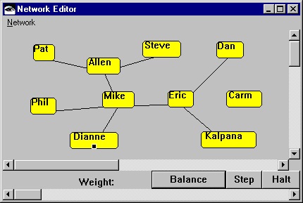 We’ll use the ScrollBar at the bottom to let users adjust the weights between nodes when one is selected, and we’ll provide feedback on what the current value is using a simple StaticText pane. We’ll use the Balance, Step, and Halt buttons to start the simulation that updates the display to reflect the weights assigned to each connection, but we don’t have to worry about those things until we are able to create and connect nodes.