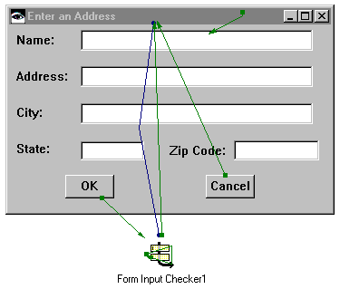 In addition to checking individual typed fields after each loses focus or on a keystroke-by-keystroke basis, you can use a Form Input Checker part to check for errors on an entire form or window part when a certain event occurs, such as clicking a push button.