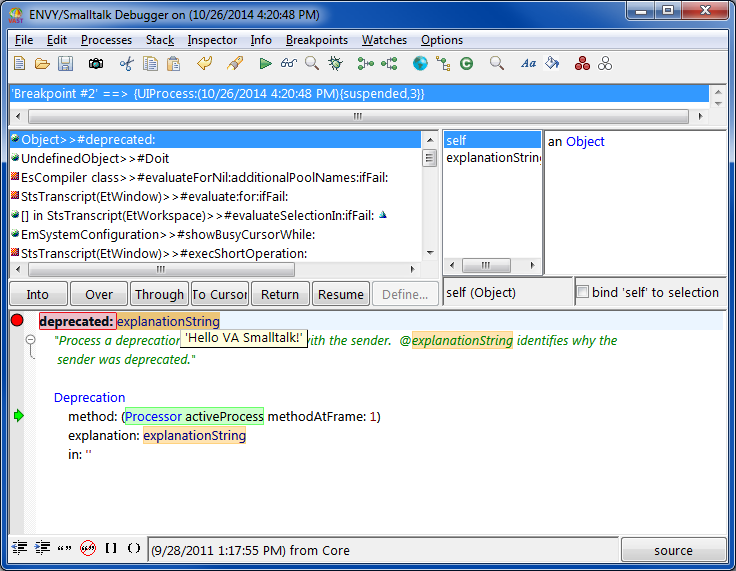 Debuggers - Code completion even hooks into the debugger. In addition to all the capability provided by a general Smalltalk browser, code completion will use the runtime information available to resolve types of variables and arguments.