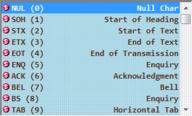 Character Literal Suggestions: One of the goals of code completion is to show useful information in the completion popup at all points. While you certainly don't need assistance in typing a single character, it may be useful for you to see a set of suggestions that describes the ASCII table. This can be achieved by typing '$' followed by a request for code completion. What you will be looking at is the non-extended ASCII table, in suggestion form, and you will be able to search by name or ASCII value. This is also helpful for completing some of the non-printable characters, which are usually referenced by pool variables. Code completion is aware of what pool variables are visible in your current context and will provide a full scoped reference to a character pool variable if necessary. The following shows an example of what character literal suggestions look like.